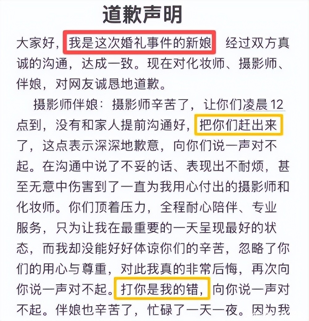 细看其声明内容,她逐一确认多项核心事实:承认将摄影师拒之门外并实施推搡;向伴娘致歉时,将恶劣态度归因为“连续数日未合眼、身心濒临崩溃”;针对化妆师,则如实交代了推倒化妆品、使用小号骚扰、泄露隐私等行为,唯独对“藏匿物品”“扬言扔物”等措辞轻描淡写,称“属情绪激动下口不择言”。